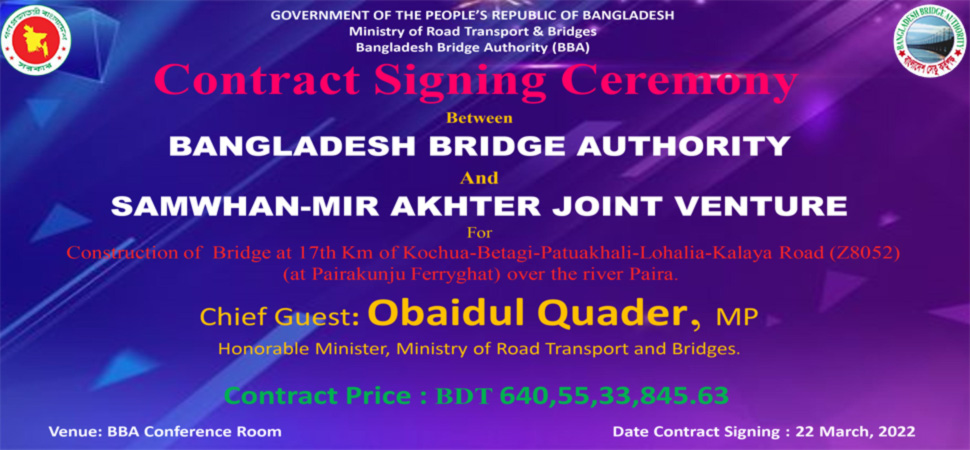 Contract Signing Ceremony Between Bangladesh bridge Authority and Samwhan-Mir Akhter Joint venture